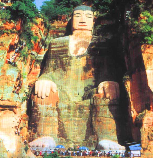 大佛体态匀称,神势肃穆,依山凿成,临江危坐。大佛通高71米,头宽10米,发髻1021个,耳长7米,鼻长5.6米,眉长5.6米,眼长3.3米,肩宽28米 ,手指长8.3米,脚背宽8.5米,可围坐百人以上,被诗人誉为“山是一尊佛,佛是一座山”,为世界第一大佛(世界上最大的石刻弥勒佛坐像)。大佛左侧,沿“洞天”下去就是凌云栈道的始端,全长近500米。右侧是九曲栈道。